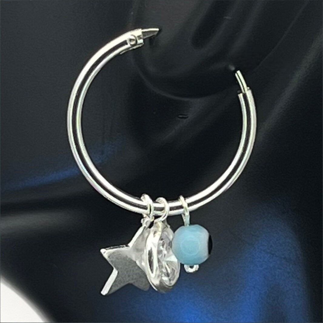 Real Silver Minimalist Evil Eye Earring Hoops 3 Hanging Charms, Star, Evil Eye. An Excellent Gift for Her, or Gift for Mom.